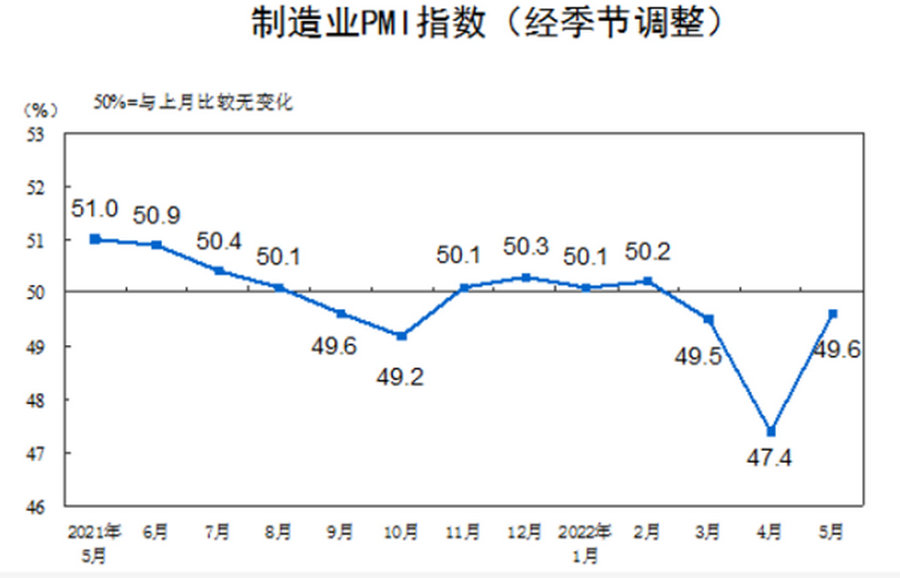 據國家統計局、中國物流與采購聯合會發布,2022年5月中國制造業采購經理指數為49.6%,相較于4月回升2.2%。這表明前期疫情形勢和國際局勢等因素對經濟運行造成的較大沖擊,隨著高效統籌疫情防控和經濟社會發展逐漸改善。